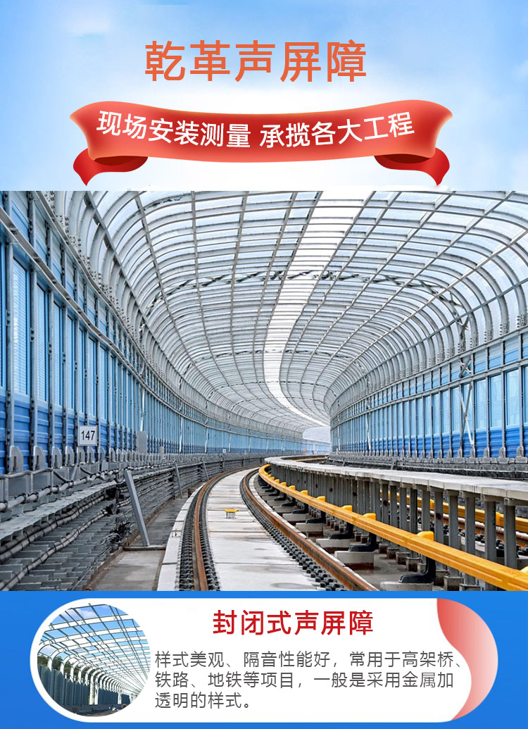 封閉式聲屏障常用于高架橋、鐵路、地鐵等項目,一般是采用金屬加透明的樣式。